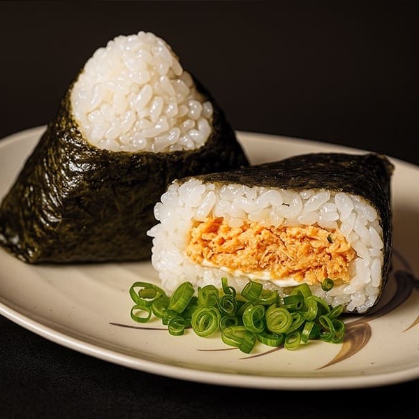 Bolinho de arroz japonês com alga, levemente salgado. Recheado com salmão grelhado ou atum em conserva, maionese e cebolinha. Escolha o recheio e experimente o bolinho mais famoso do Japão. Arroz cozido com água Kangen (alcalina) Foto meramente ilustrativa.
