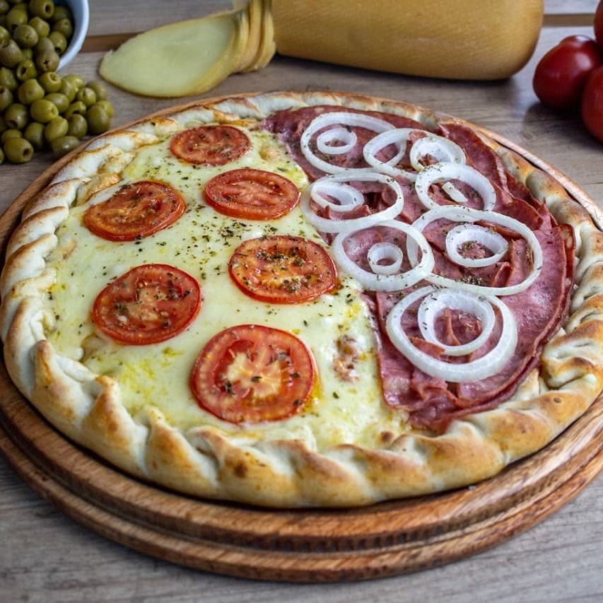 1 Pizza Mussarela + 1 Pizza Calabresa + Borda Recheada Grátis