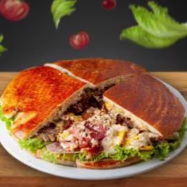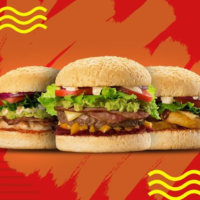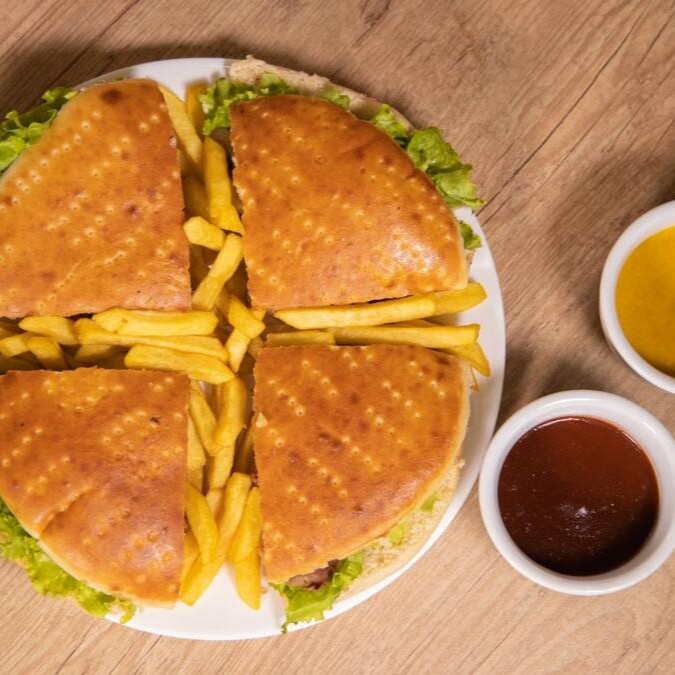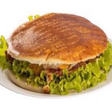 Pão, hambúrguer artesanal, mussarela, presunto, bacon, ovo, calabresa, cheddar, frango, salada e molho especial