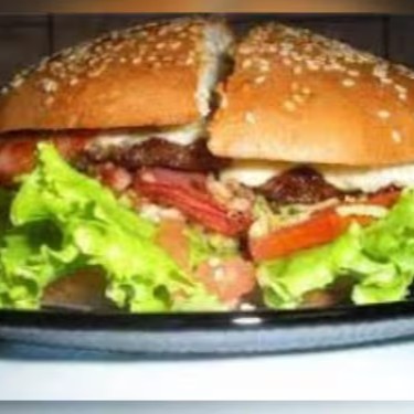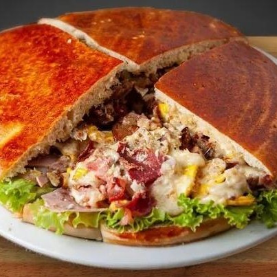 Hambúrguer, queijo, bacon, calabresa, presunto, ovo, frango, alface, tomate e maionese.