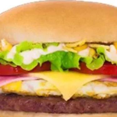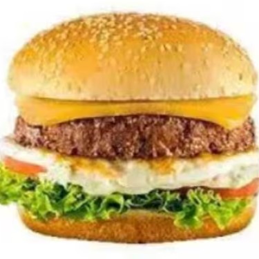 Hambúrguer, queijo, ovo, alface, tomate e maionese.