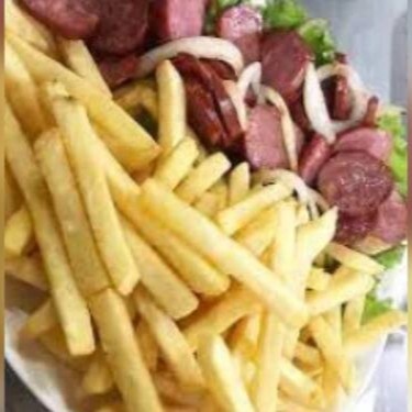 Porção de fritas e calabresa.