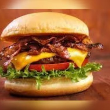 Hambúrguer, queijo, bacon, alface e tomate.