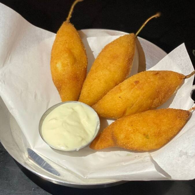 Porção de 4 unidades de pimenta dedo de moça recheada com carne moída com coentro no estilo mexicano.