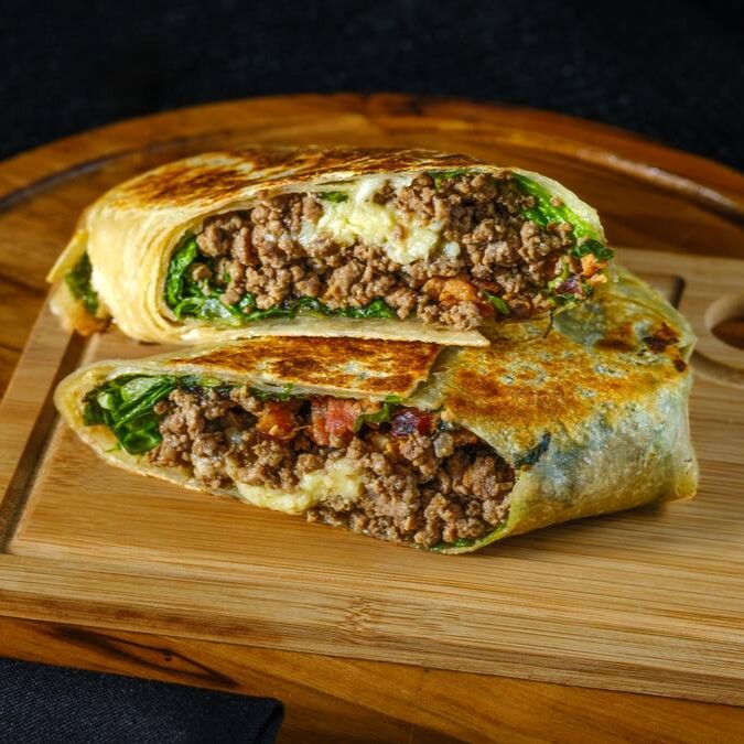 Duas massas de trigo tradicional, carne moída, repolho, bacon, barbecue, mussarela e cream cheese.