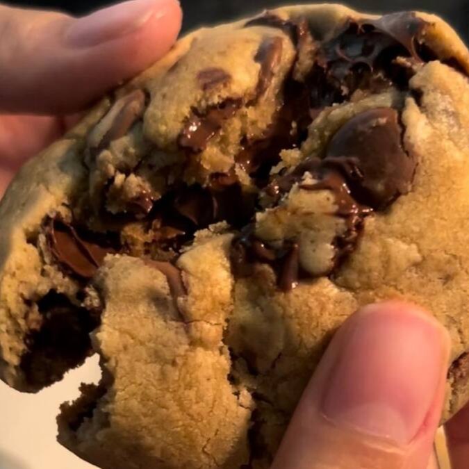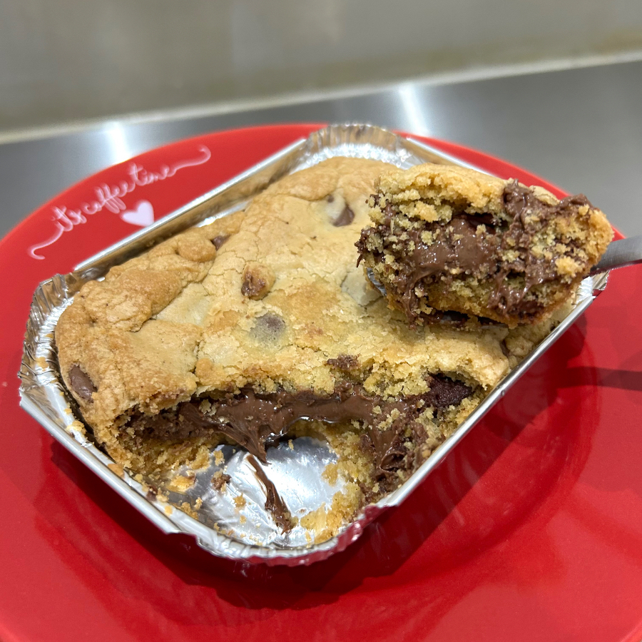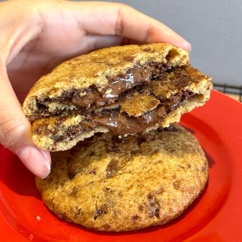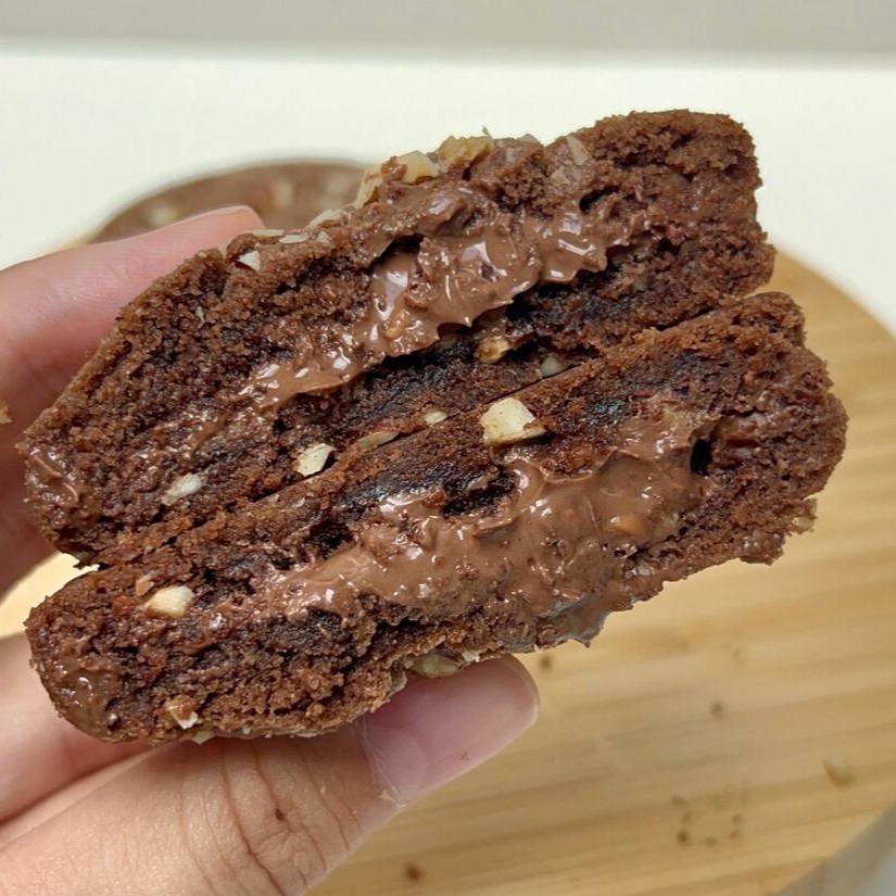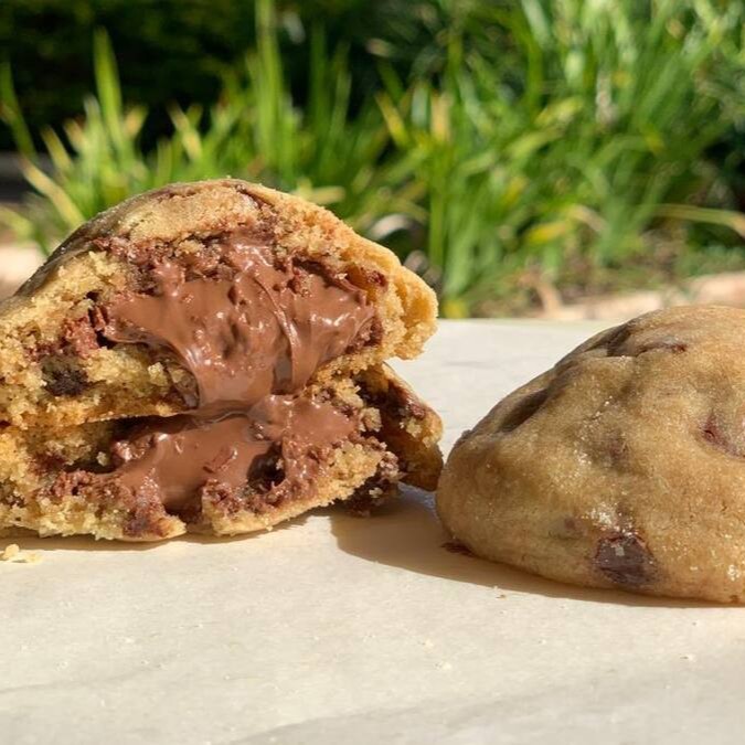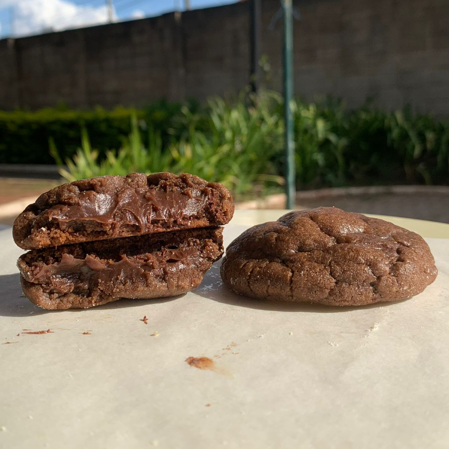 Cookie de massa tradicional, levemente crocante por fora, macio por dentro e recheado com bastante Nutella cremosa.
