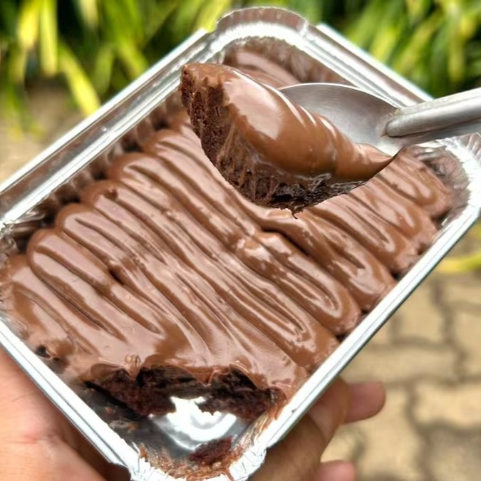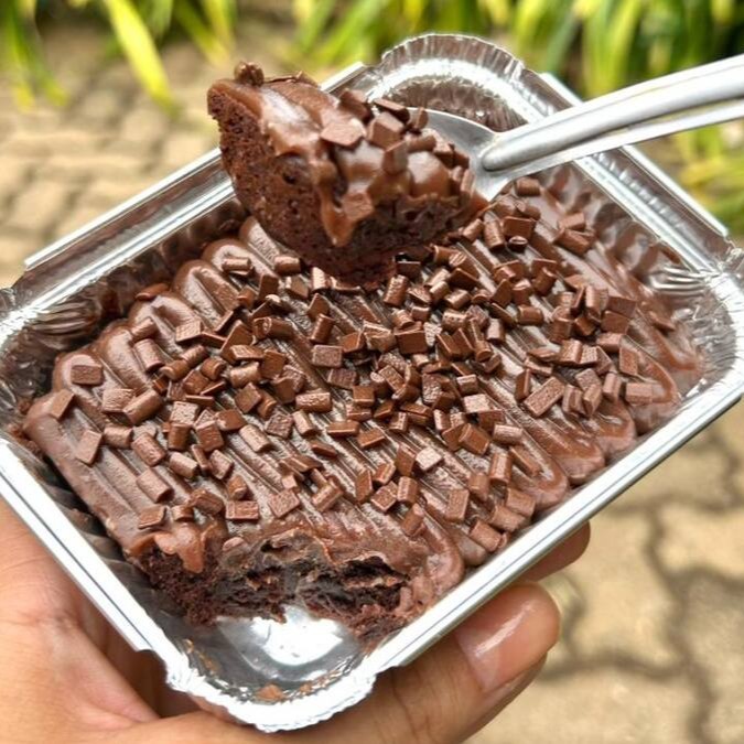 Brownie feito com massa de chocolate nobre e cacau, cremoso por dentro e com casquinha por fora, coberto com brigadeiro gourmet e finalizado com granulado de chocolate nobre.