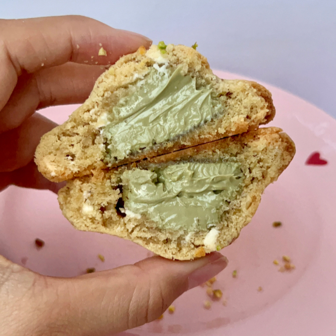 Nosso cookie de pistache é feito com massa tradicional e gotas de chocolate branco, recheado com creme de pistache. Finalizado com pistache triturado por cima, é uma delícia que combina sabor e textura em cada mordida!