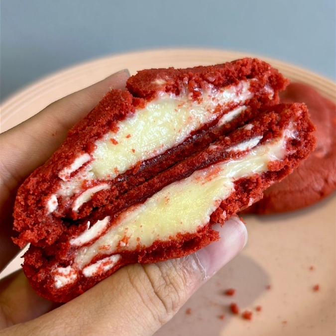 Cookie de red velvet com massa macia, leve toque de cacau e gotas de chocolate branco. Recheado com brigadeiro de cream cheese, trazendo o contraste perfeito entre doce e levemente ácido.