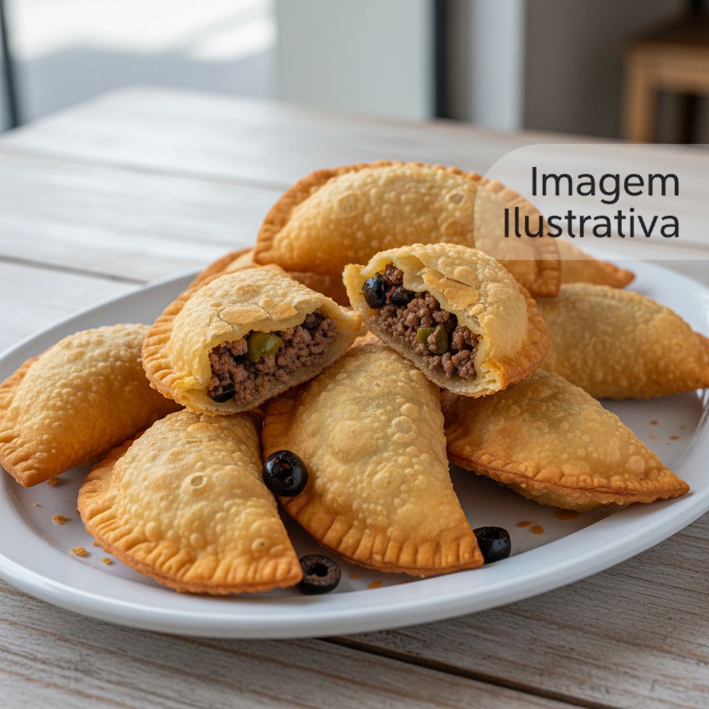 Pastel recheado com carne moída, azeitonas pretas e temperos, uma combinação clássica e saborosa.