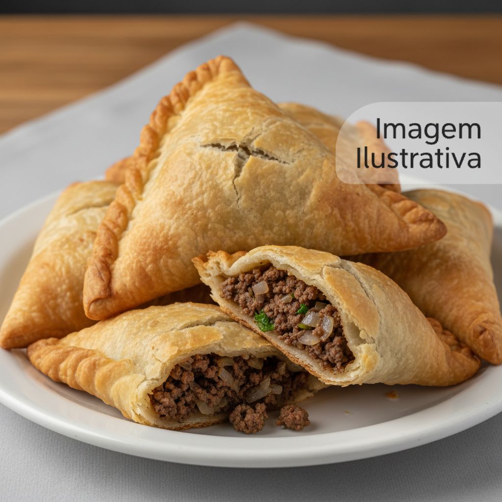 Delicioso pastel recheado com carne moída temperada e cebola picada, frito até ficar crocante.