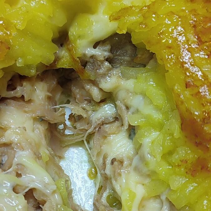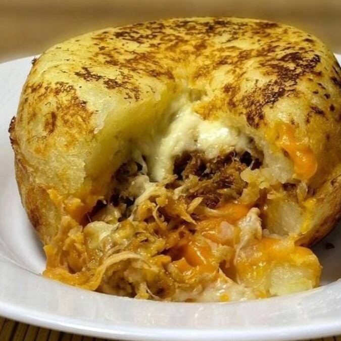 Pernil de porco desfiado e temperado, azeitona, cebola e um queijo de sua preferência.