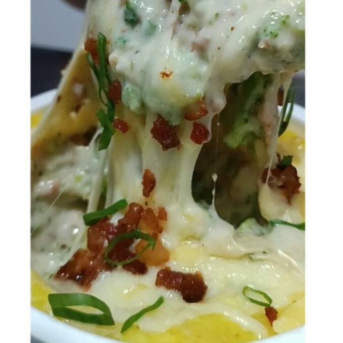 Delicioso molho branco artesanal, cremoso com brócolis, milho e bacon.