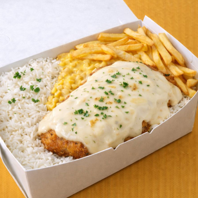 Executivo Parmegiana de Frango Caipira é feito com um suculento filé de frango empanado ao creme de milho, acompanha arroz e fritas