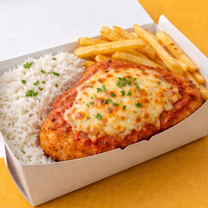 Executivo Parmegiana de Frango acompanha arroz e fritas