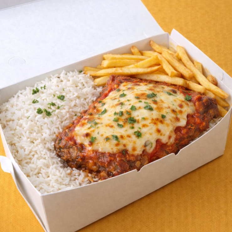 Executivo Parmegiana de Carne acompanha Arroz e Fritas