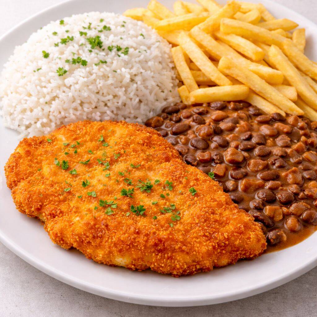 Arroz, feijão, filé de frango a milanesa e batata frita