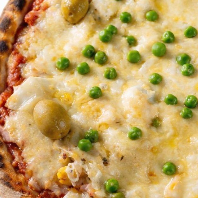 Deliciosa pizza grande com 8 fatias de Portuguesa - Massa, molho de tomate, mussarela derretida, ovo cozido, presunto, cebola marinada, ervilha e orégano.