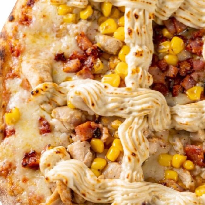 Deliciosa pizza grande com 8 fatias de Frango com Bacon - Massa, molho de tomate, mussarela derretida, frango em cubos, cream cheese especial, milho e bacon.
