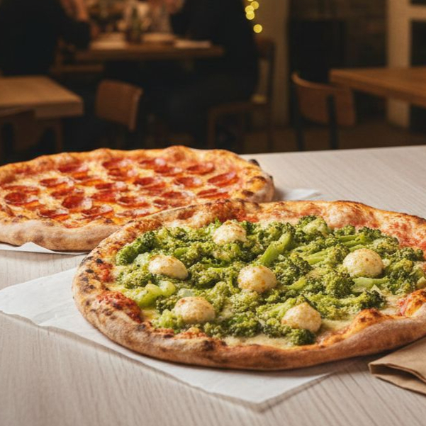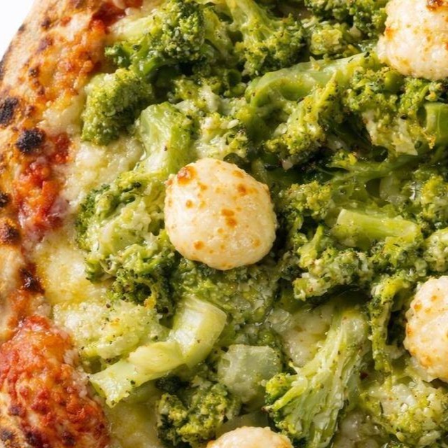 Deliciosa pizza grande com 8 fatias de Brócolis - Massa, molhpo, mussarela, brocolis com alho e bacon