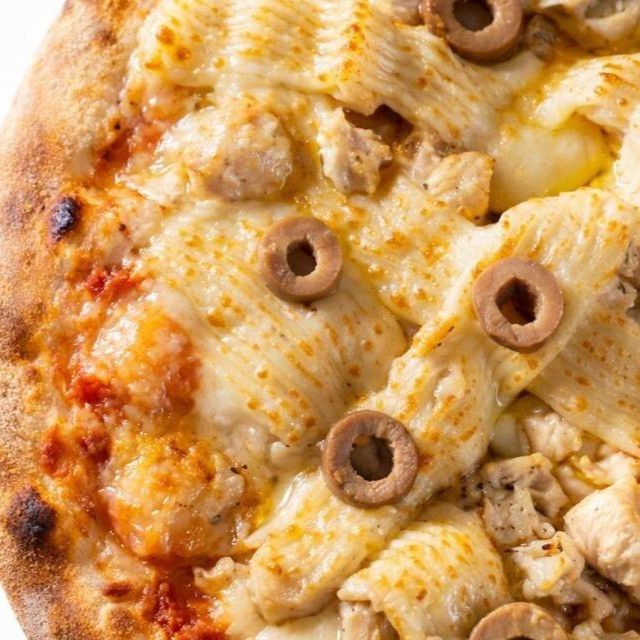 Deliciosa pizza grande com 8 fatias de Frango com Catupiry - Massa, molho de tomate, mussarela derretida, frango em cubos, Catupiry e azeitona preta.