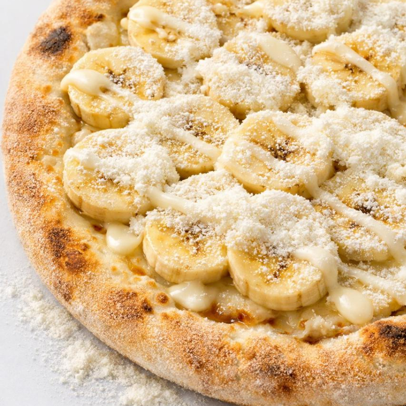 Deliciosa pizza Broto com 4 fatias de Banana gratinada - Massa, creme de leite, banana e chocolate branco gratinado.