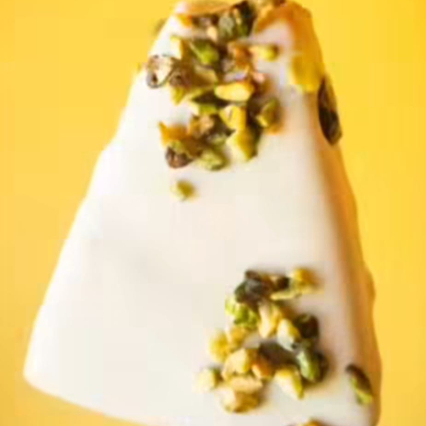 Se você ama Pistache, esse é o Pudim no Palito. Pudim feito com pasta importada de pistache, transformado em sorvete e finalizado com calda de chocolate branco.