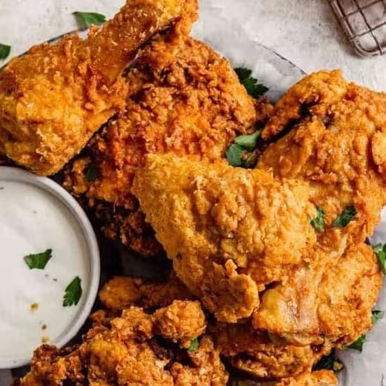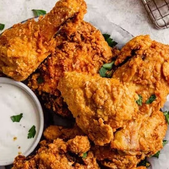 Pedaços variados de frango (tulipinha, coxinha da asa, filé de sassami) super crocantes (aproximadamente 1kg), com um tempero especial, empanados e fritos.
