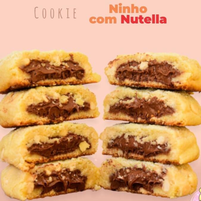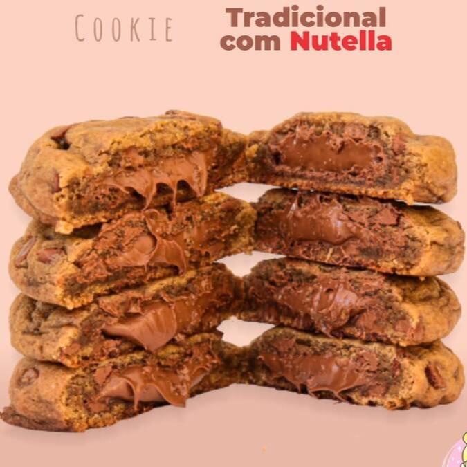 Massa tradicional com gotas de chocolate ao leite e recheio de creme de avelã (Nutella). Aproximadamente 90g.