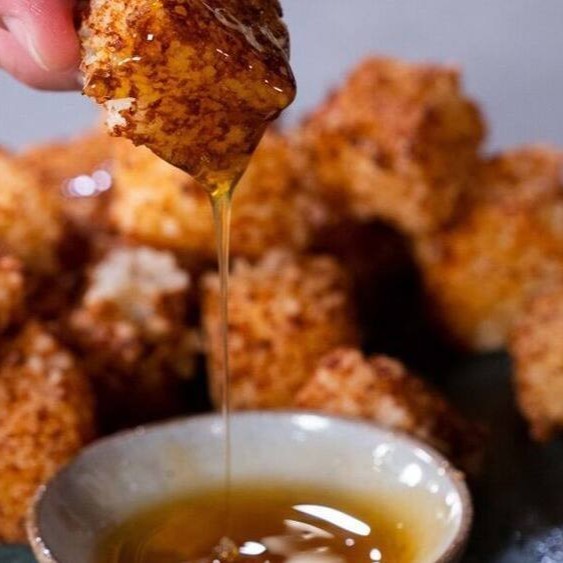 Pedaços de filé de Sassami super crocantes (aproximadamente 250g), com um tempero especial, empanados e fritos.