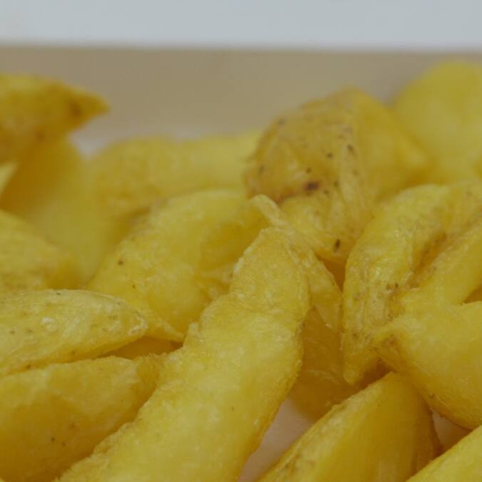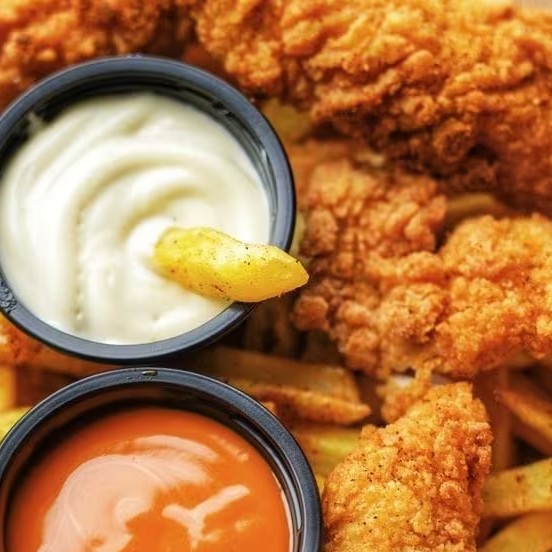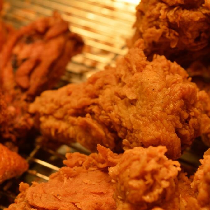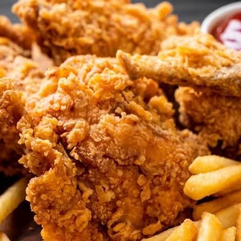 Pedaços variados de frango (sobrecoxa, meio da asa, coxinha da asa, filé de sassami) super crocantes (aproximadamente 250g), com um tempero especial, empanados e fritos.