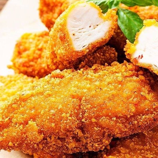 Pedaços de filé de Sassami super crocantes (aproximadamente 1kg), com um tempero especial, empanados e fritos.