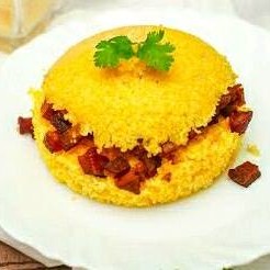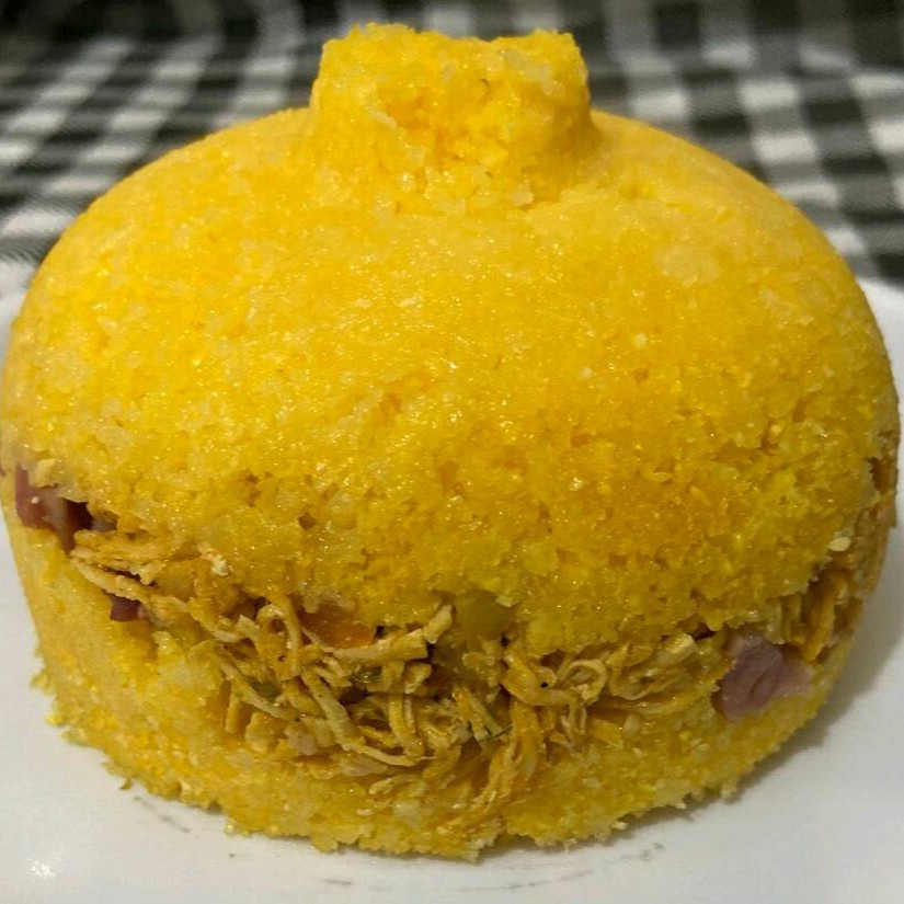 Cuscuz de calabresa, Catupiry, bacon, queijo mussarela e acompanha vinagrete