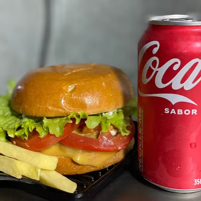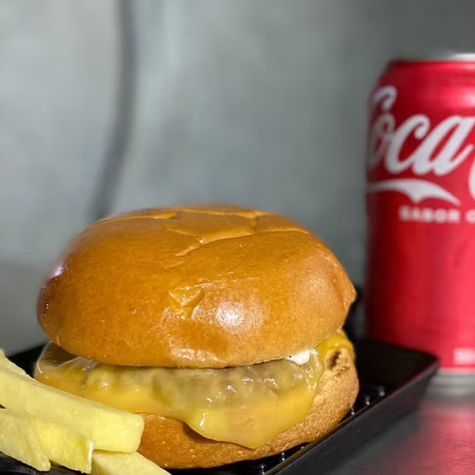 Pão de brioche, queijo prato, blend de hambúrguer smash 100 gramas, e finalizado com uma deliciosa maionese temperada e defumada acompanhado de uma Lata + Batata Pequena.