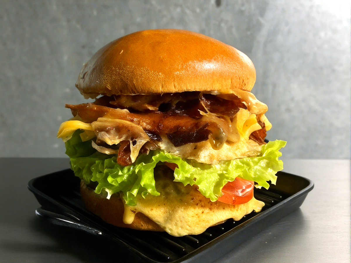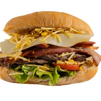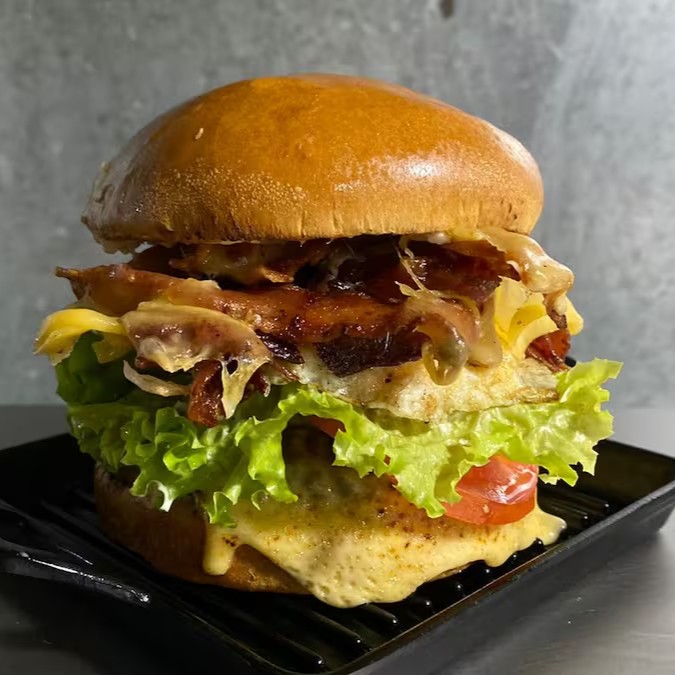 Pão de brioche, 1 hamburgueres artesanais 160g cada, filé de frango, calabresa, salsicha, queijo prato, alface, tomate, ovo, bacon, Catupiry Original e molho especial.
