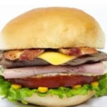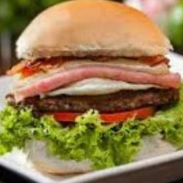 Pão, 2 hamburgueres, queijo prato, presunto , alface, tomate, ovo, bacon e molho especial.