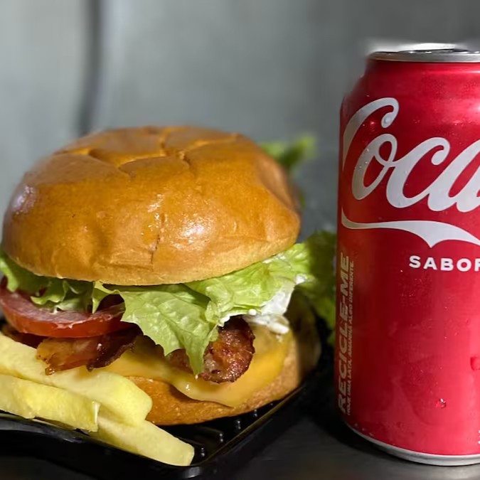 Pão de hamburguer, mussarela, presunto, alface, tomate, bacon e molho especial, acompanhado de uma coca lata geladinha e uma deliciosa porção de fritas de 180g.