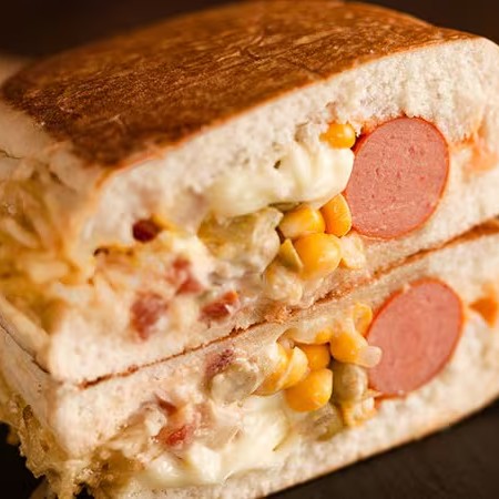 Hot Dog Duplo Prensado (Cachorro Quente Prensado) --> Pão, 2 salsicha, milho, vinagrete, purê, batata palha, catchup, maionese e mostarda.