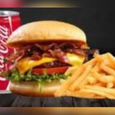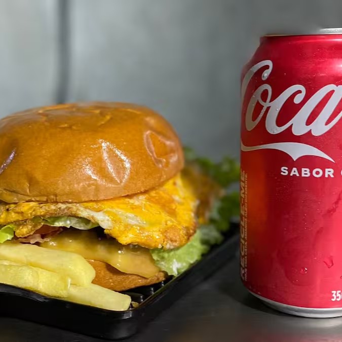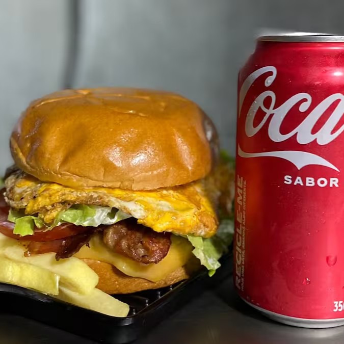 Pão de hamburguer, 2 hamburgueres, mussarela, presunto, alface, tomate, ovo, bacon e molho especial, acompanhado de uma coca lata geladinha e uma deliciosa porção de fritas de 180g.