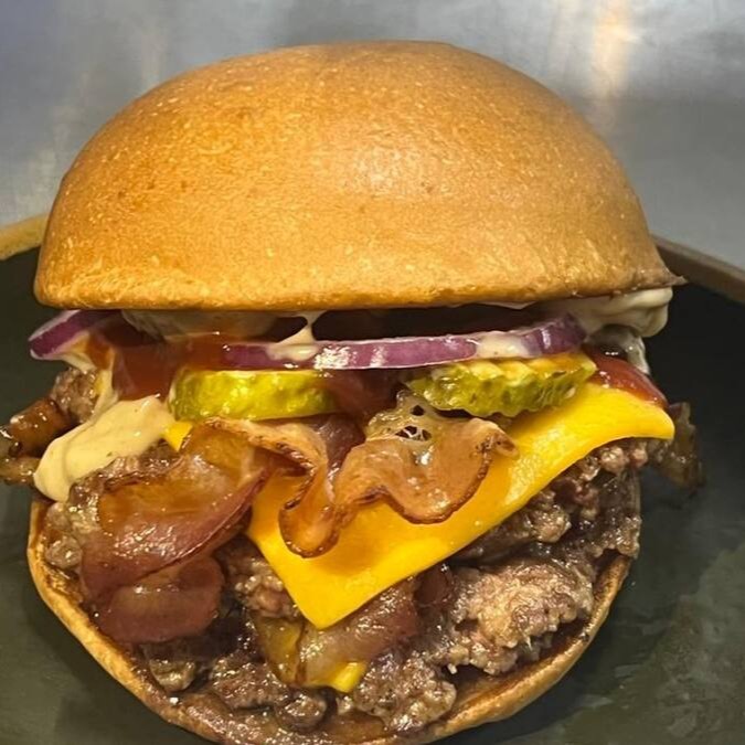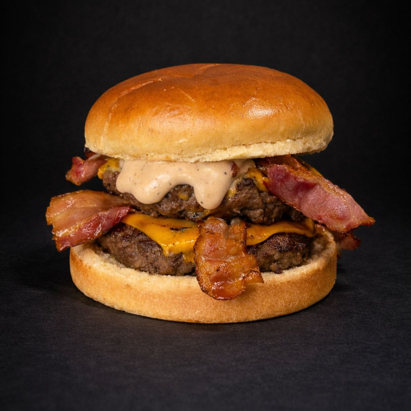 Pão Brioche, 2 Burguer's, 2x bacon, 2x Queijo Cheddar, Maionese Tasty