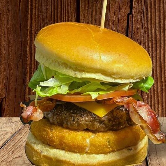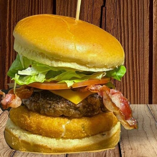 Pão Brioche, Burguer, Bacon, Alface, Tomate, Queijo Cheddar, Maionese Branca Heinz e Catupiry empanado.