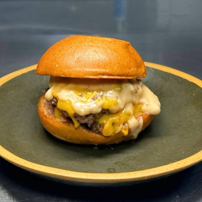 Pão Brioche, Burguer, Queijo Cheddar, Maionese Tasty.