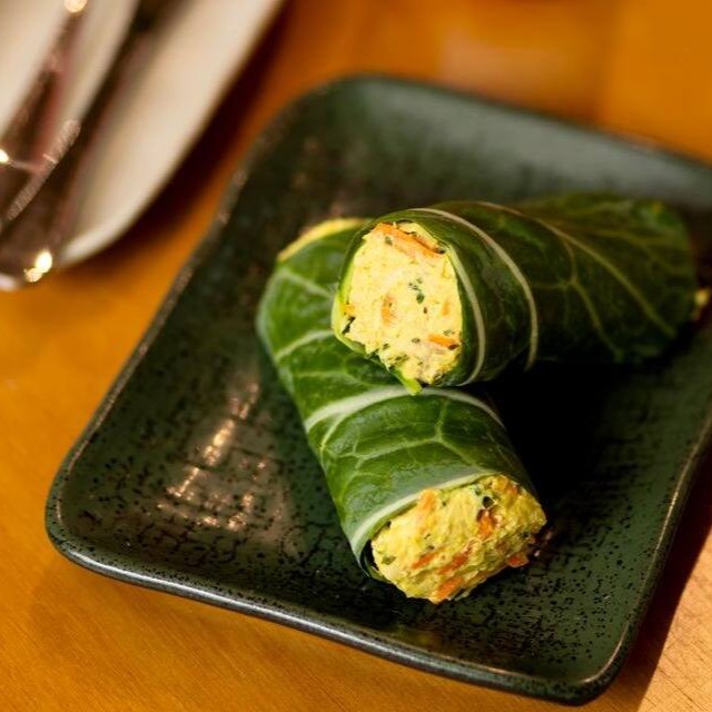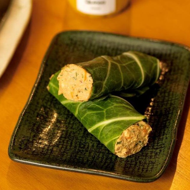 Pasta de atum a base de cream cheese com nosso temperinho especial, cenoura, nozes e azeitonas verdes, envolta em uma folha de couve crocante.