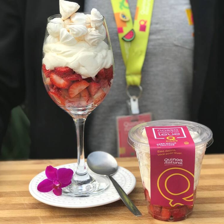 Camadas alternadas de morangos frescos picados, chantilly fresco e mini suspiros de whey.