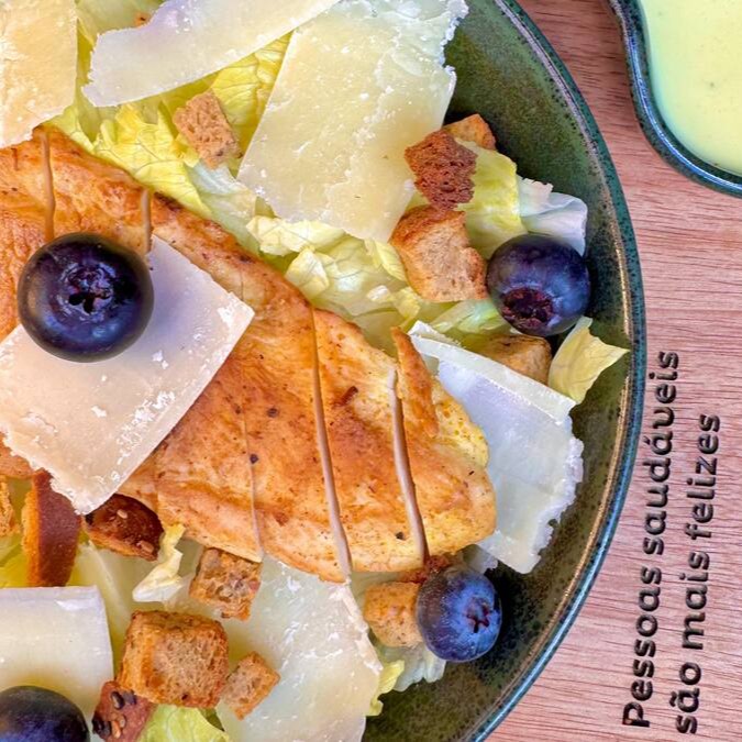 Alface americana, filé de peito de frango em tiras, lascas de parmesão maturado, croutons sem glúten feito por nós, mirtilos frescos e molho Ceaser sem lactose.