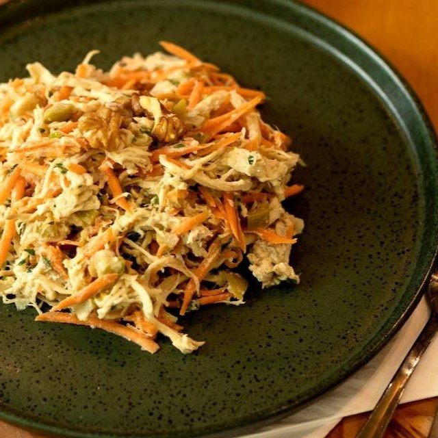 Preparado com peito de frango desfiado , cenoura ralada, nozes, azeitona verde, creme de leite fresco zero lactose e temperado com muito amor!