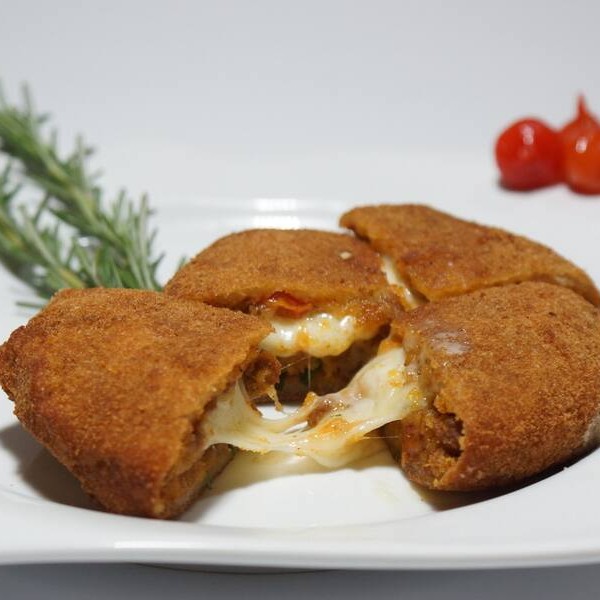 Um saboroso disco de carne moída muito bem temperado recheado com queijo muçarela e empanado na massa de mandioca