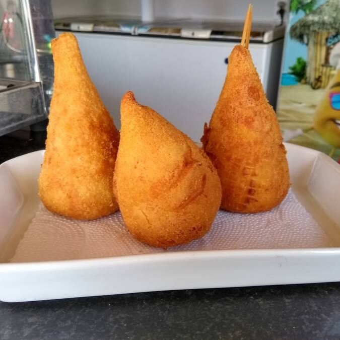 Deliciosa coxinha feito com massa de mandioca recheado com frango desfiado. Frito na hora.