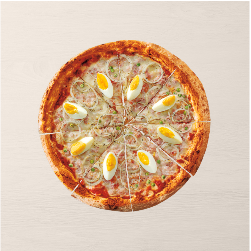 Molho de tomate, presunto, mussarela, ovo cozido, ervilha, cebola e orégano.