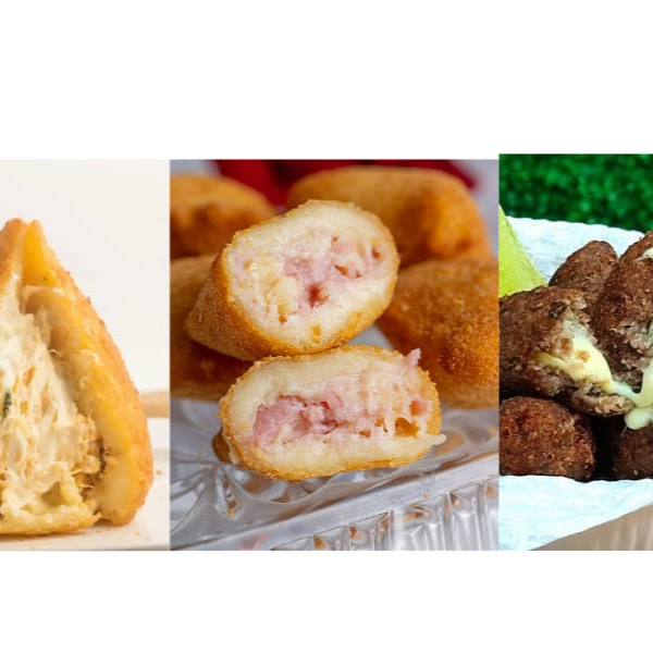 50 unidades de 20gr Até 3 sabores no pacote (frango com requeijão, carne, presunto e queijo ou bolinha de queijo) Pronto para fritar